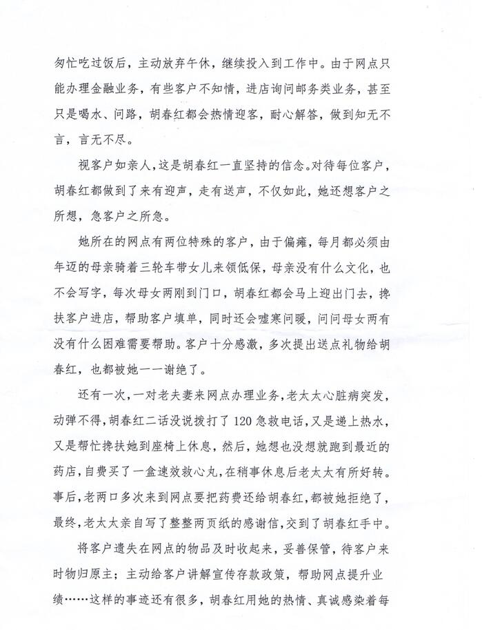 還有一次,一對老夫妻來網(wǎng)點辦理業(yè)務,老大大心臟病突發(fā),動彈不得,胡春紅二話沒說撥打了120急救電話,又是遞上熱水又是幫忙攙扶她到座椅上休息,然后,她想也沒想就跑到最近的藥店,自費買了一盒速效救心丸,在稍事休息后老太大有所好轉(zhuǎn)事后,老兩口多次來到網(wǎng)點要把藥費還給胡春紅,都被她拒絕了,最終,老大大親自寫了整整兩頁紙的感謝信,交到了胡春紅手中。將客戶遺失在網(wǎng)點的物品及時收起來,妥善保管,待客戶來時物歸原主;主動給客戶講解宣傳存款政策,幫助網(wǎng)點提升業(yè)績……這樣的事跡還有很多,胡春紅用她的熱情、真誠感染著每一位前來辦理業(yè)務的客戶。翻開客戶意見薄,里面密密麻麻地記載了客戶對于胡春紅的贊美與好評,每當想到自已的努力可以真正幫助到客戶,滿滿的成就感就會在胡春紅的心頭漾開,而這也成了她堅持下去的動力。“我在這里上班,我就是這的一份子,我愿意盡我的微薄之力,讓網(wǎng)點辦得更好!”這是胡春紅的心里話,雖然樸實,卻很感人,一如她在這平凡的崗位上,干出的不平凡的成績!